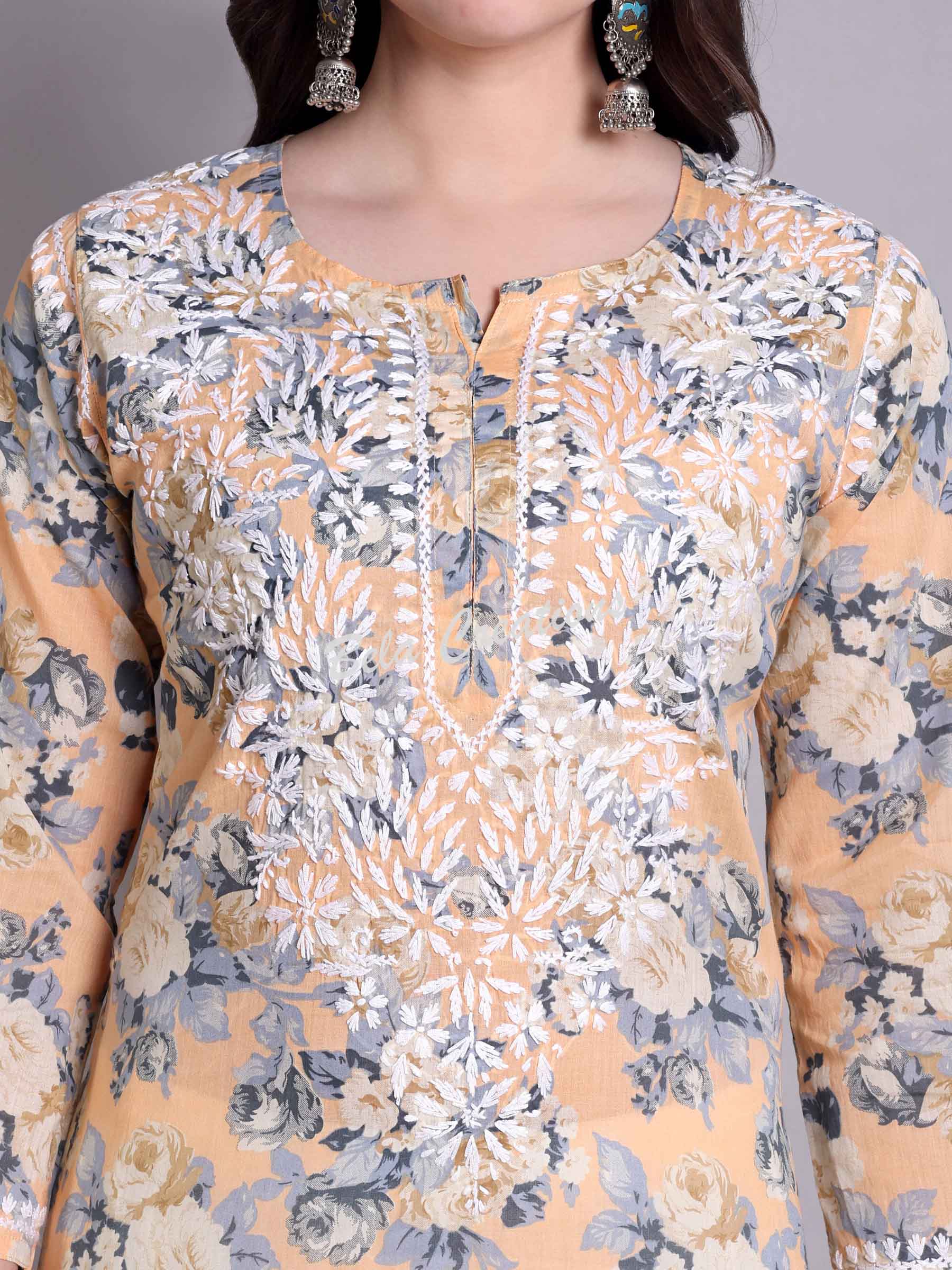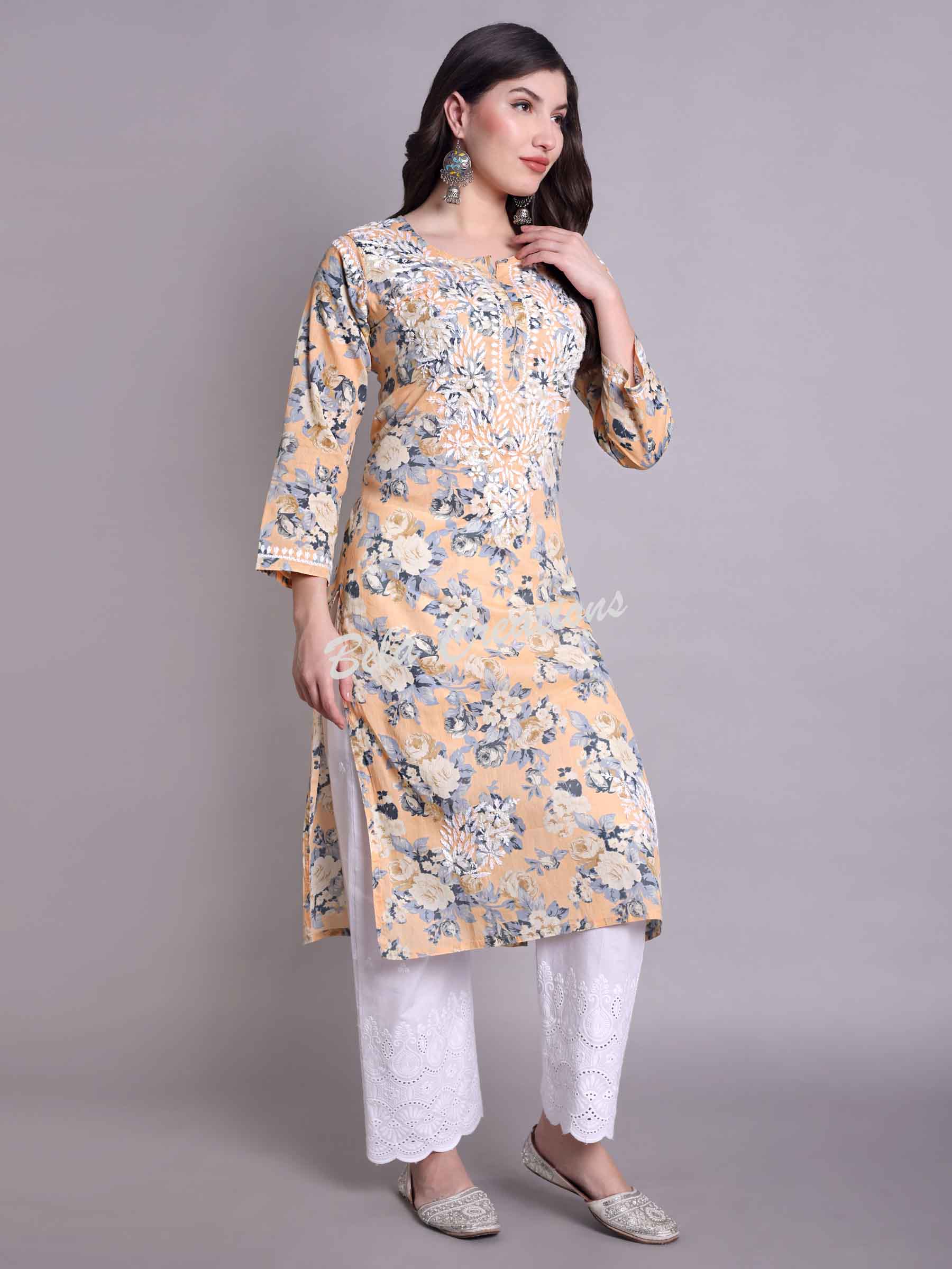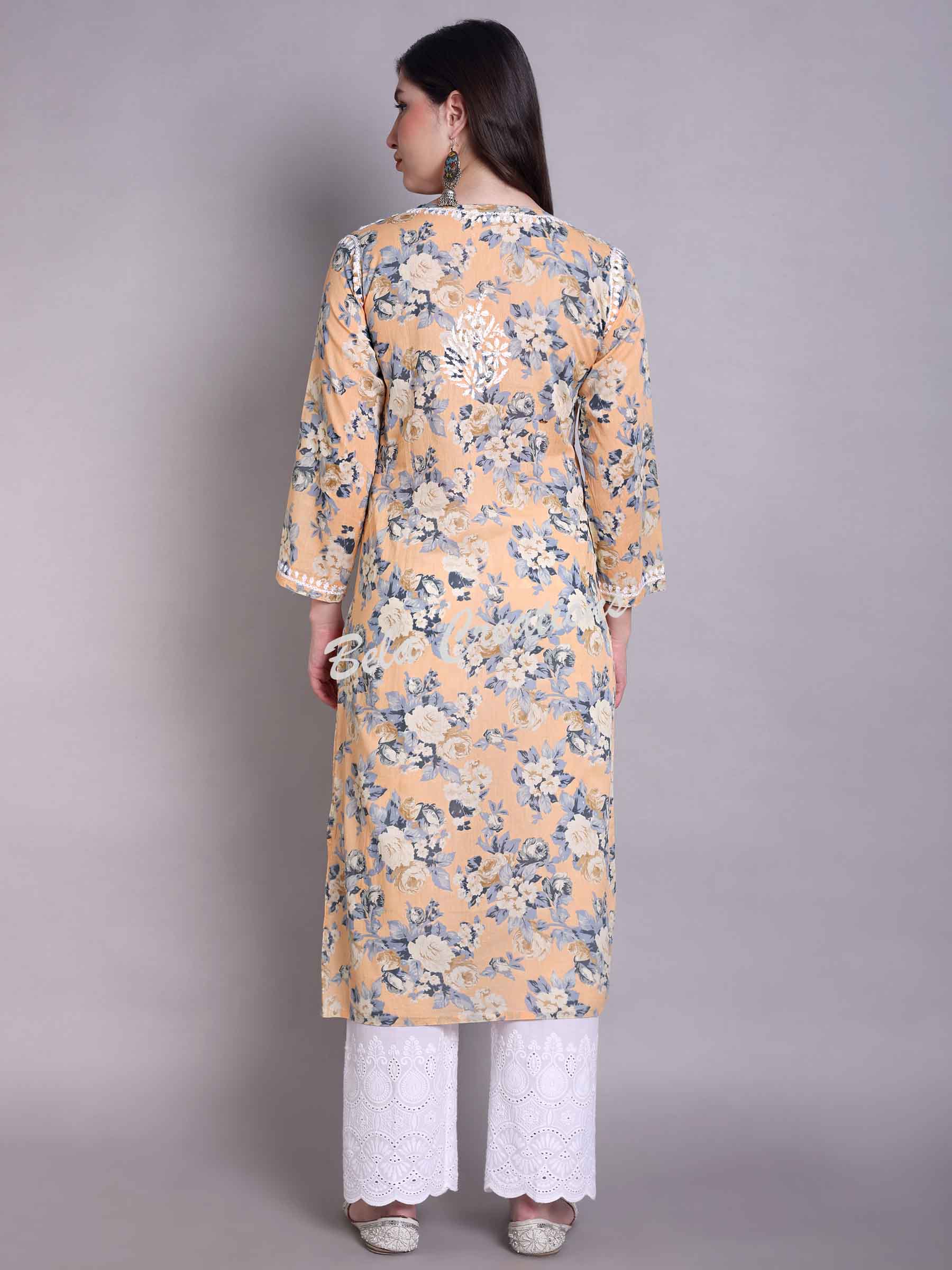 This yellow cotton kurta is light, comfortable, and easy to wear. It has white hand embroidery on the front and a soft rose print that gives it a gentle, pretty look. Great for everyday use whether you’re going to work, running errands, or relaxing at home.