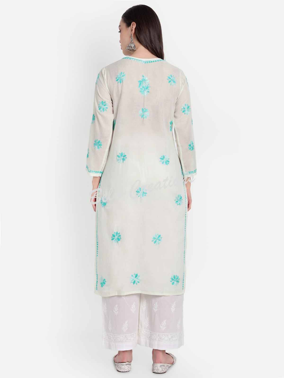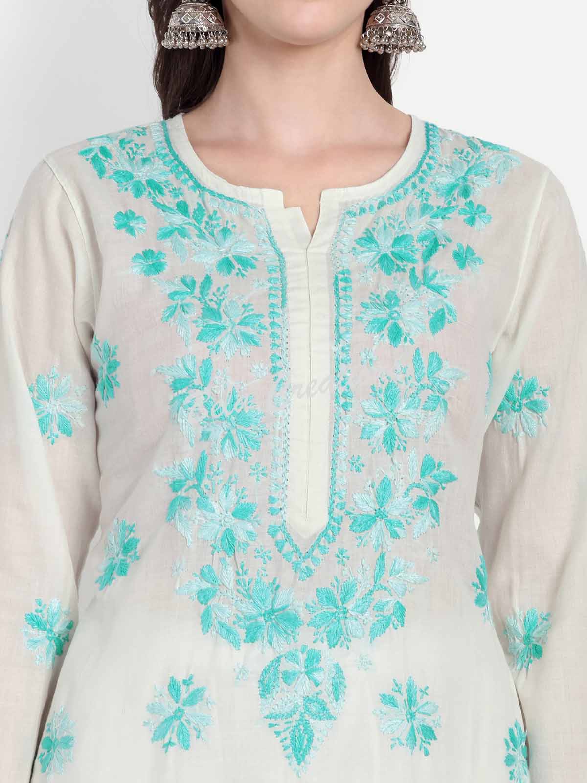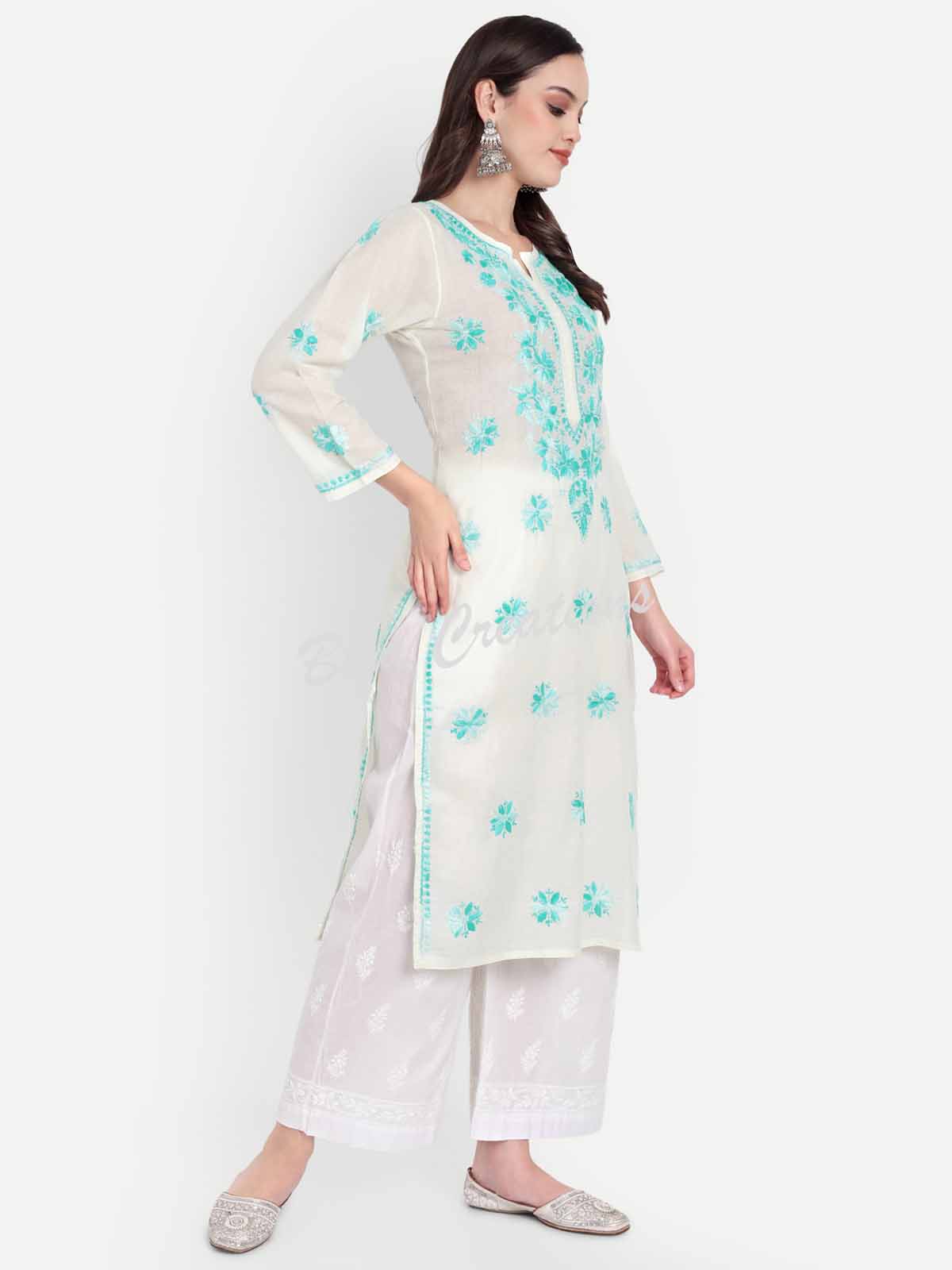 This white cotton kurta features pretty blue Chikankari embroidery with floral patterns on the yoke and all over. It’s soft, breathable, and easy to wear all day. Great for warm days, you can pair it with jeans, trousers, or palazzos for a casual or semi-formal look.