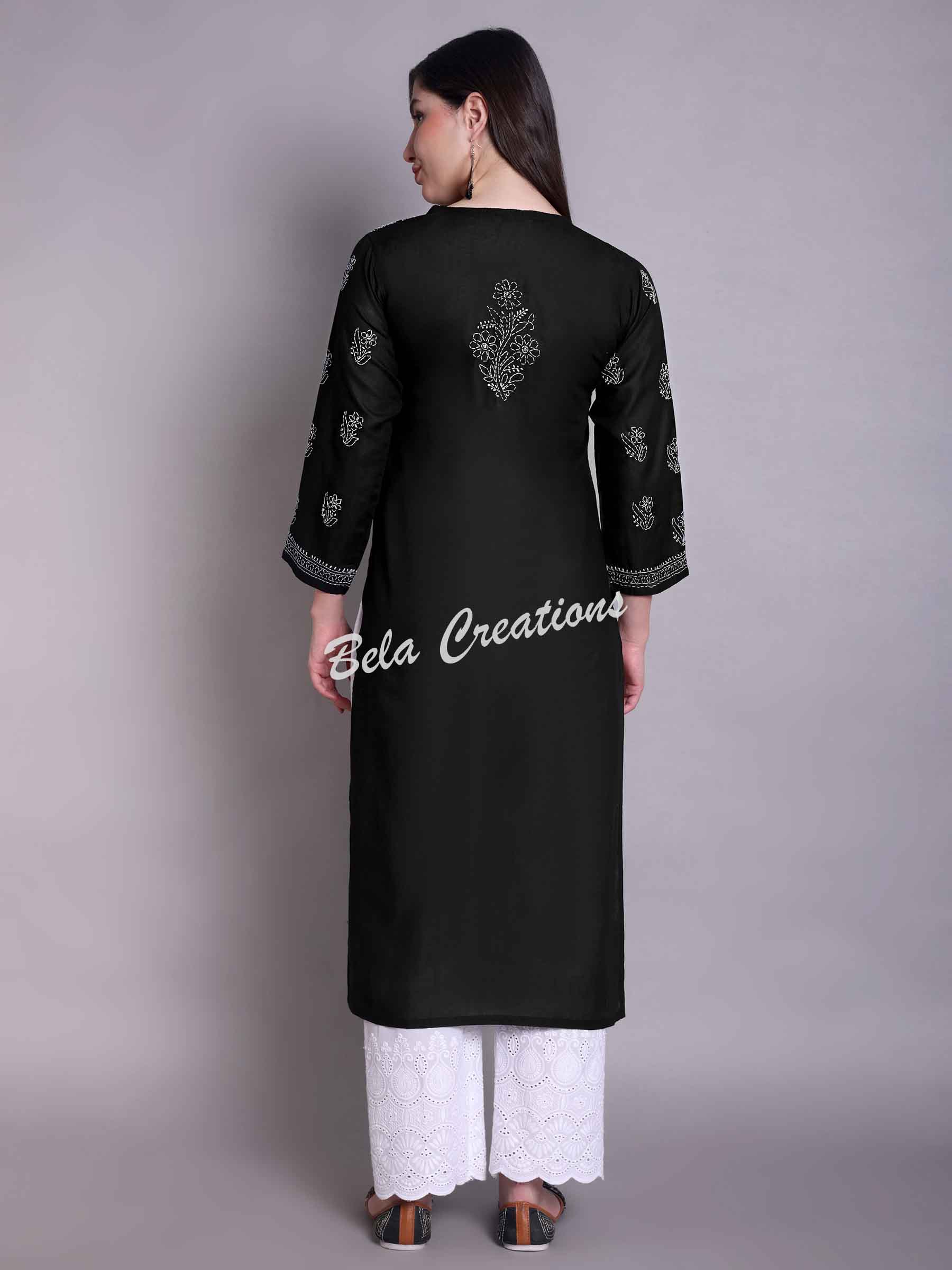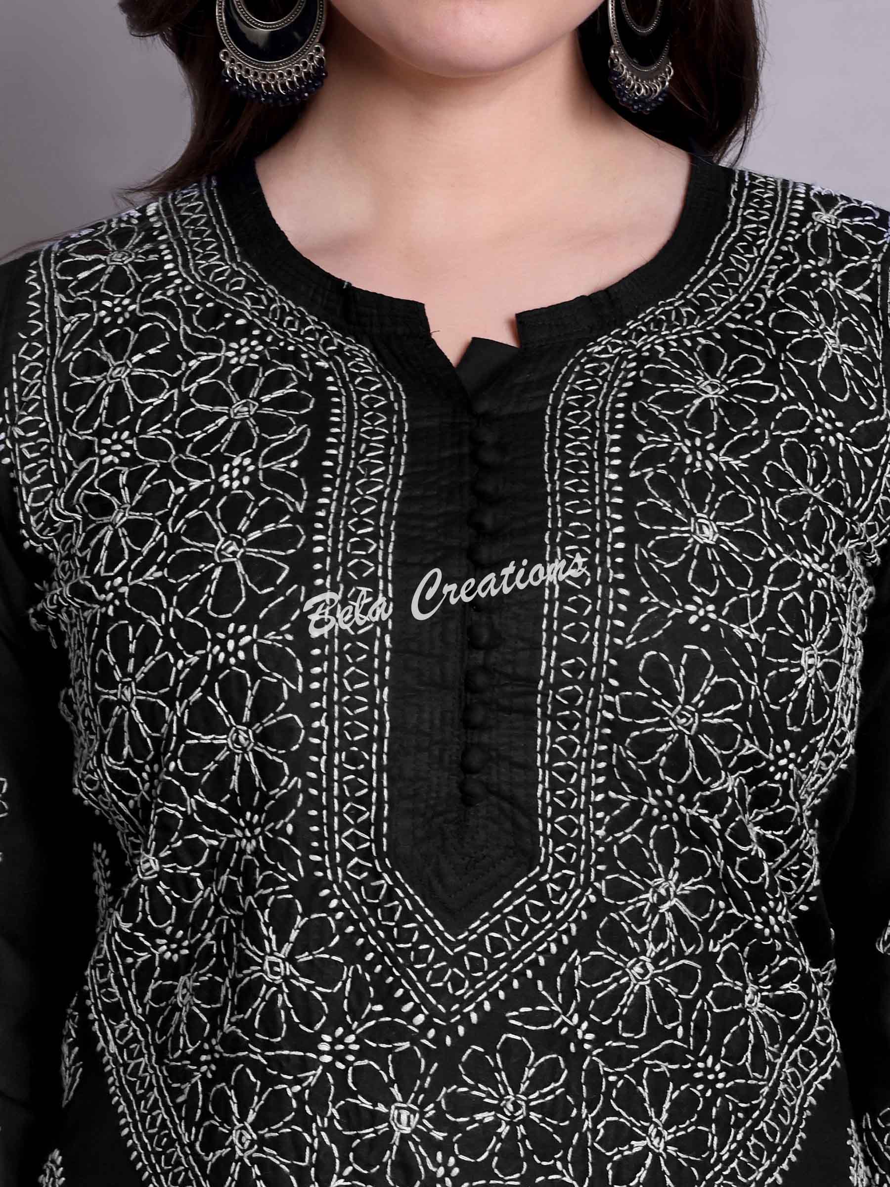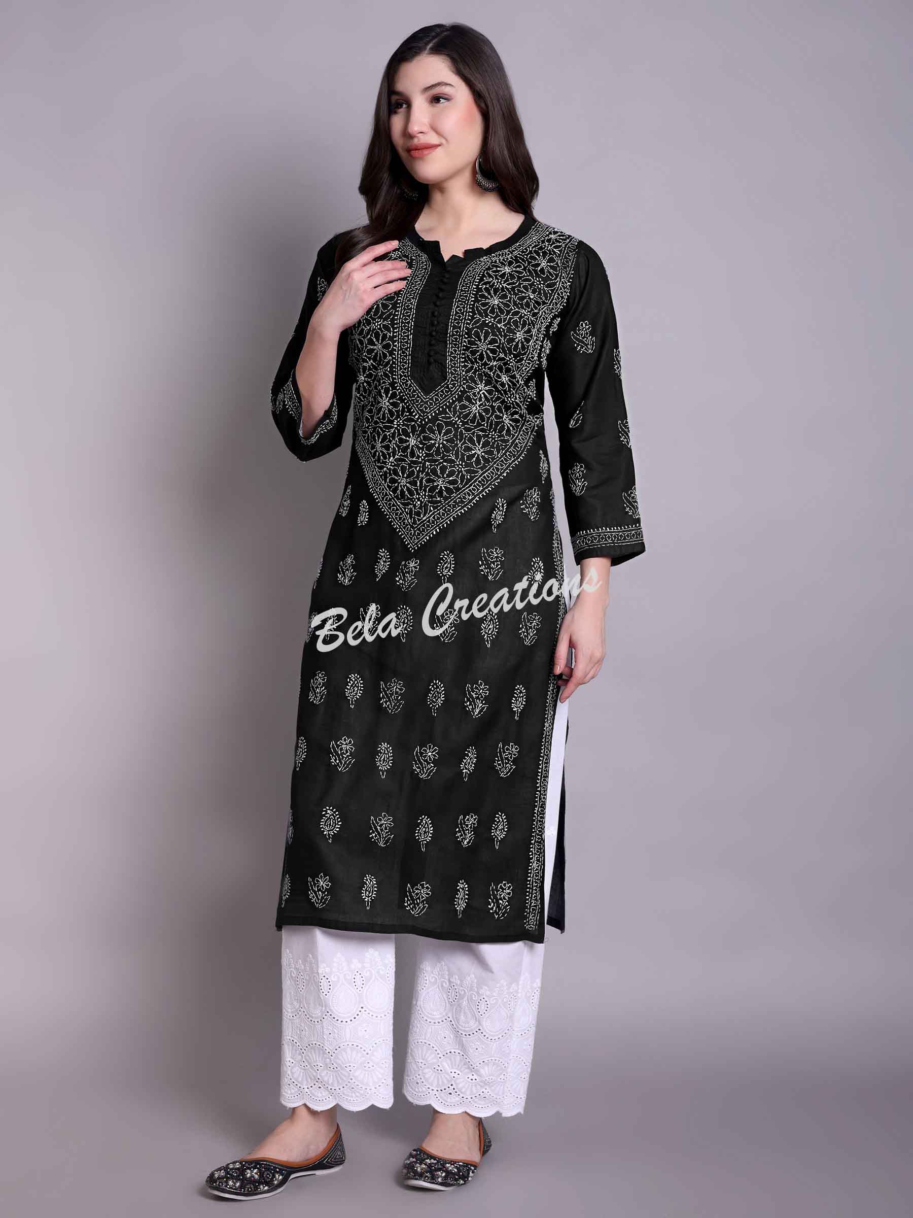 This black straight-fit kurta in pure cotton features intricate white Chikankari hand embroidery on the front panel, with delicate bootis scattered across the body. The neckline is beautifully highlighted with floral embroidery and fabric buttons along the front placket, adding just the right touch of detail. Finished with embroidered sleeve cuffs and side slits for easy movement, this kurta is a perfect blend of elegance and comfort. Pair it with white palazzos or leggings for a graceful daytime look, or dress it up with silver jewellery for festive occasions.