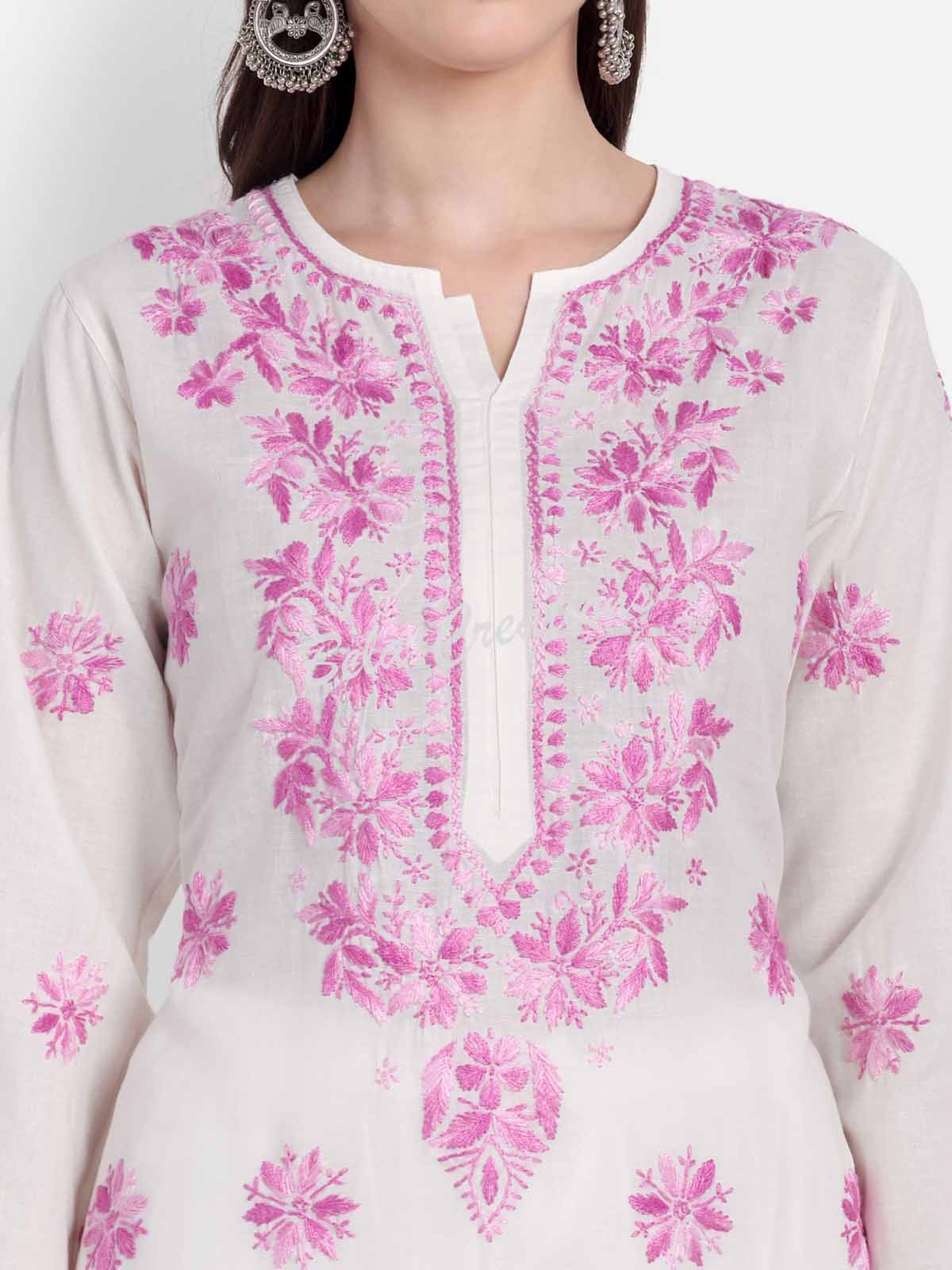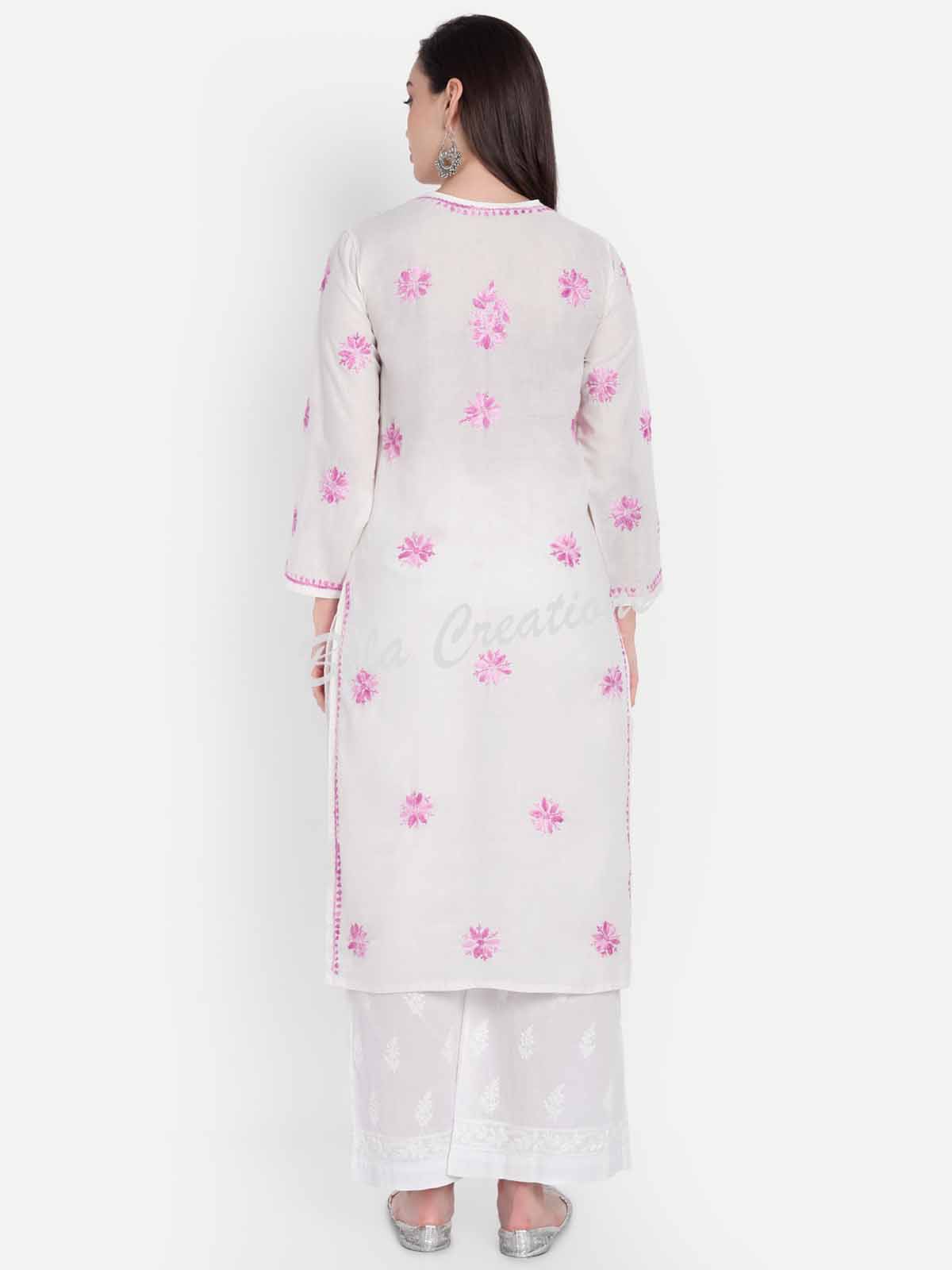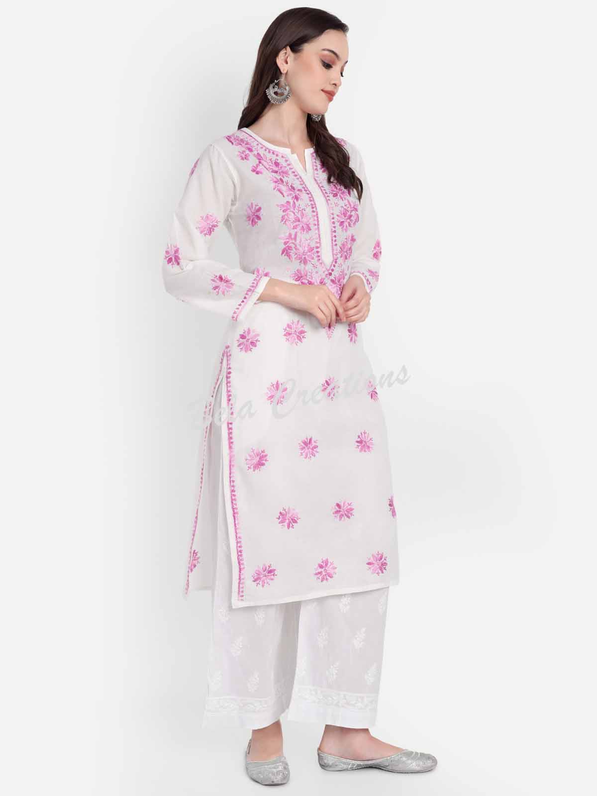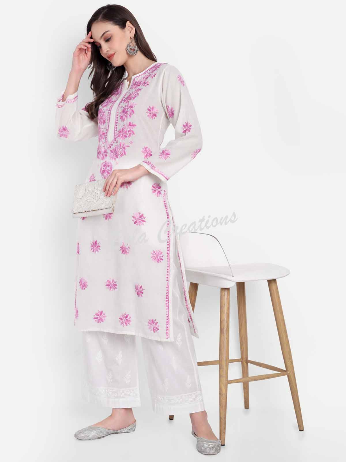 This white cotton kurta features delicate lilac Chikankari embroidery with floral designs on the yoke and scattered across the fabric. Made from soft, breathable cotton, it has a relaxed longline fit that’s easy to wear. Perfect for everyday use, festive lunches, or summer gatherings. Pair it with light or pastel bottoms for a fresh, elegant look.