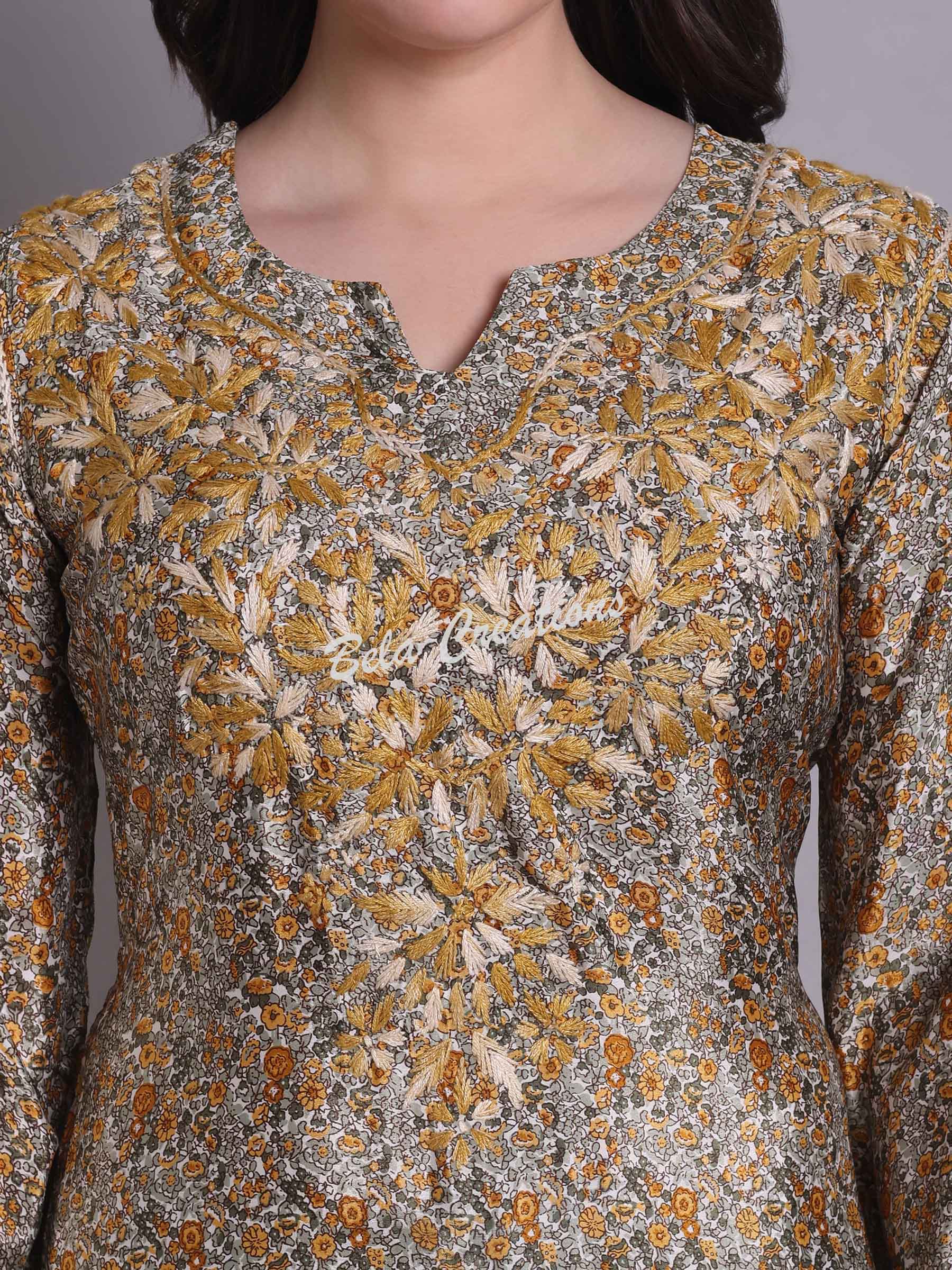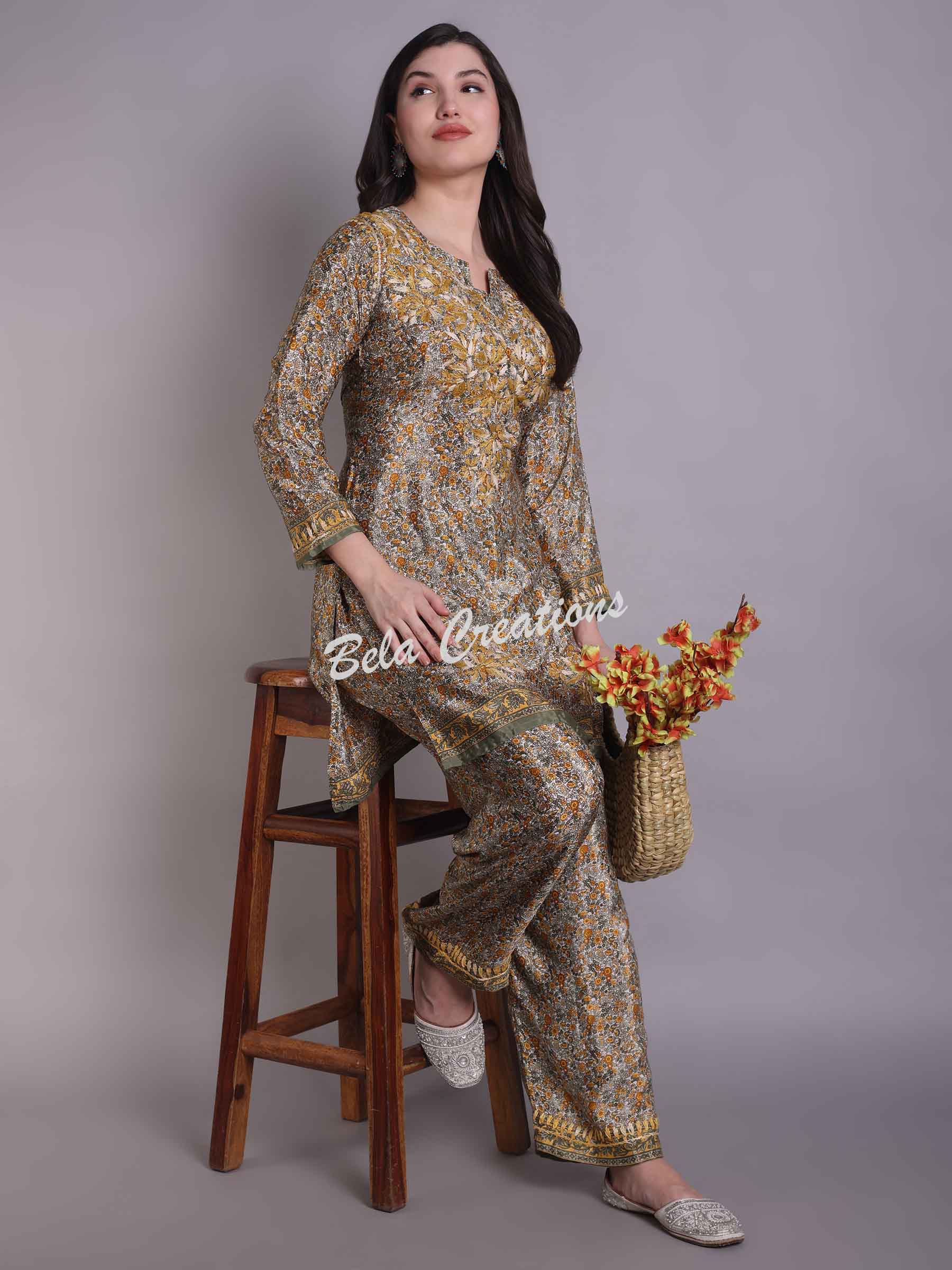 Made from soft crepe fabric, this yellow co-ord set features a cheerful floral print with subtle Chikankari embroidery on the kurta. The top has a straight fit with a notched round neck, while the matching pants have an elasticated waist for added comfort. Easy to wear and full of charm, it’s great for everyday outings or relaxed gatherings.