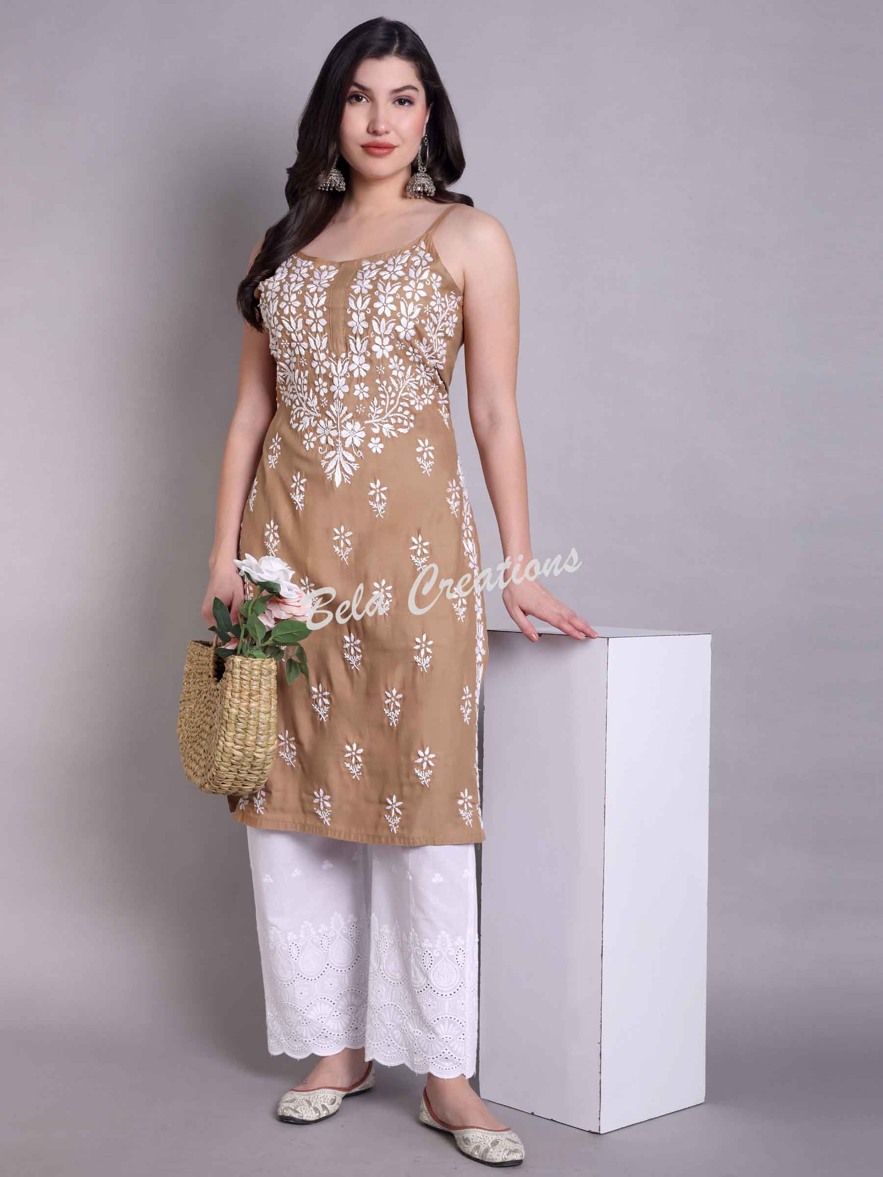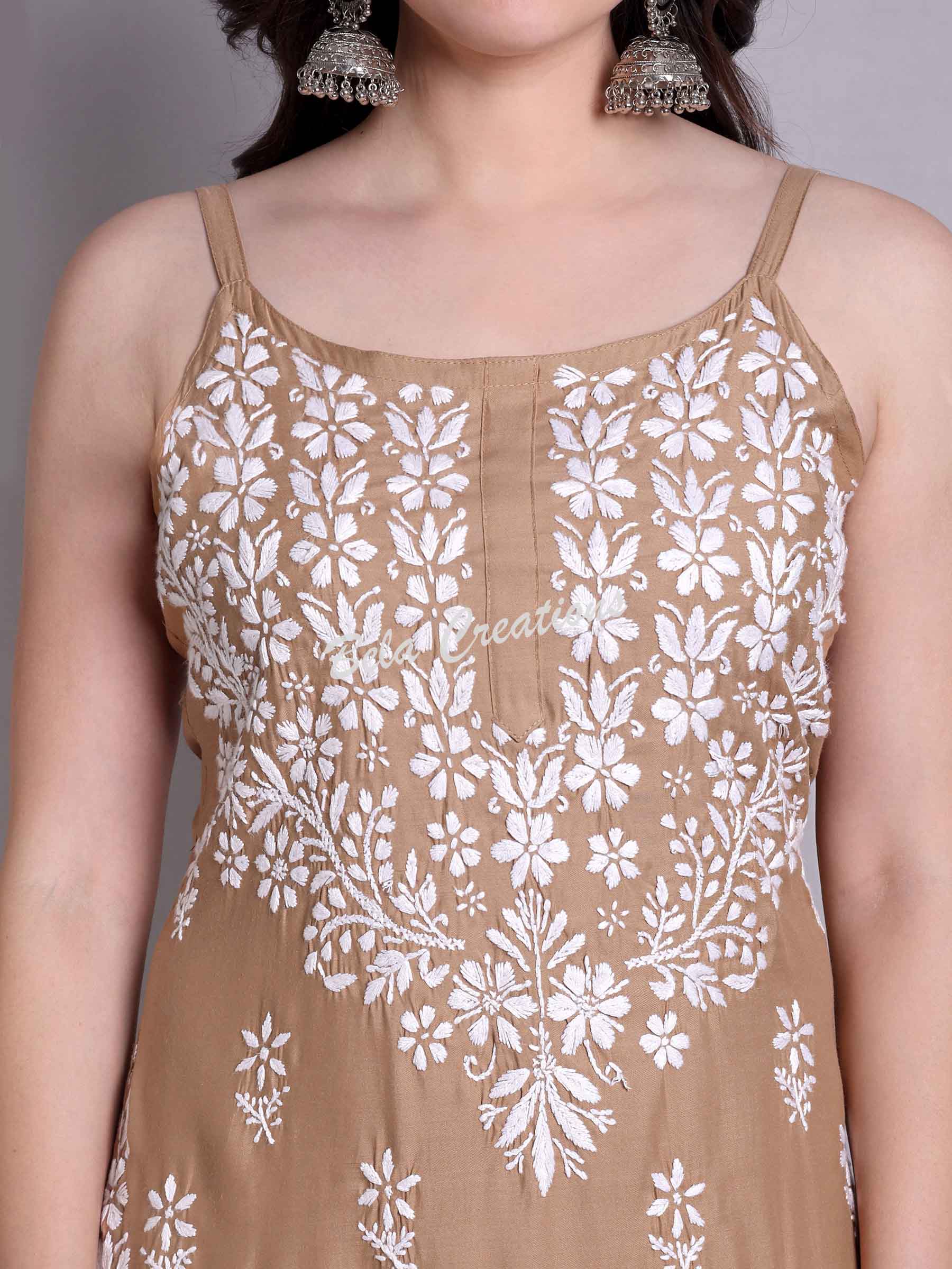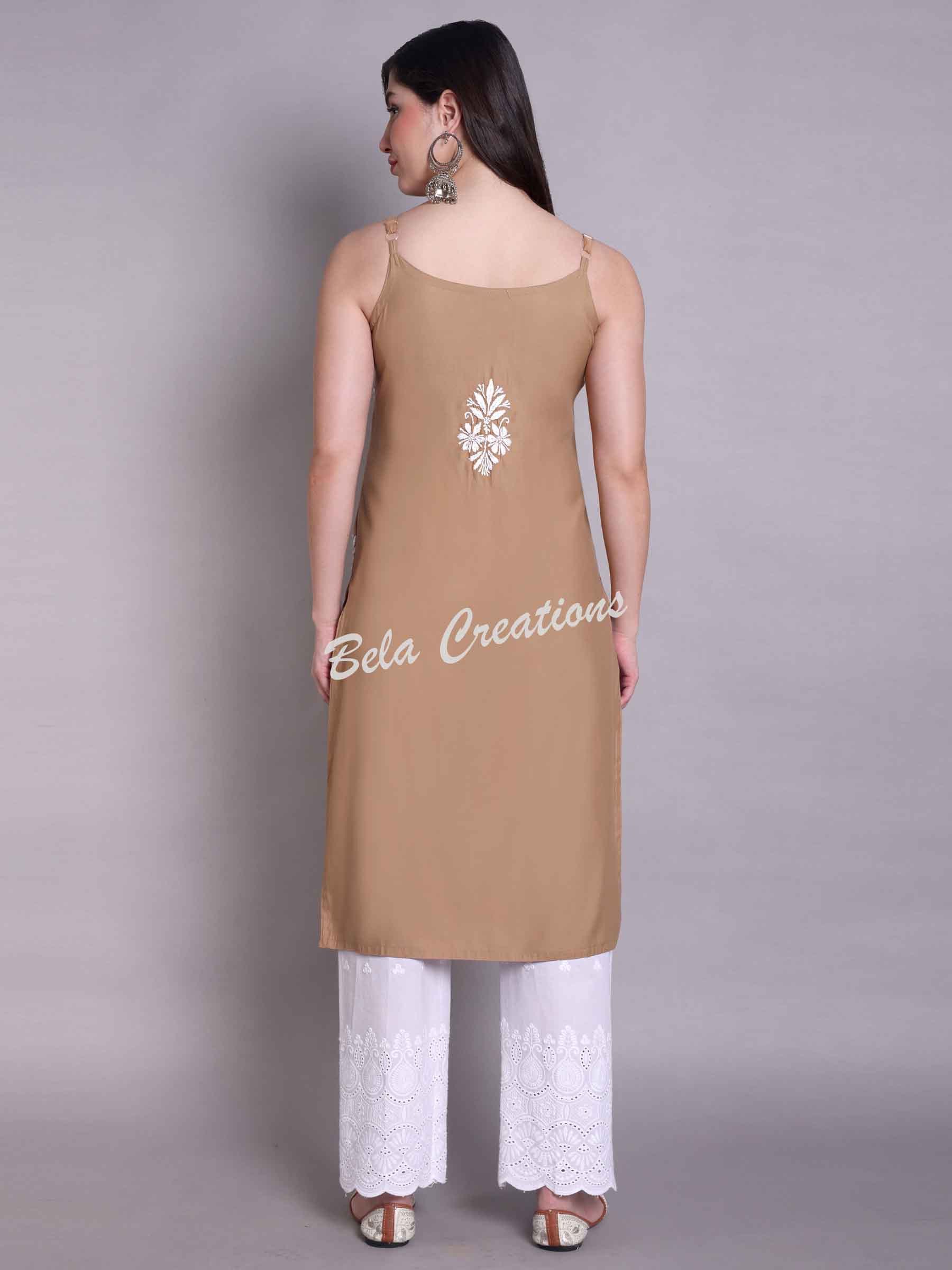 This brown sleeveless kurta is made from modal fabric and features white hand embroidery with floral and leaf patterns. It has a boat neckline, thin straps, and a straight fit with side slits. Lightweight and knee-length, it’s perfect for summer days, casual brunches, or light festive wear. Pair it with white palazzos or jeans for a relaxed look.