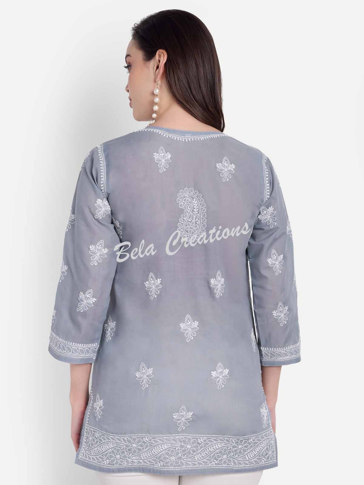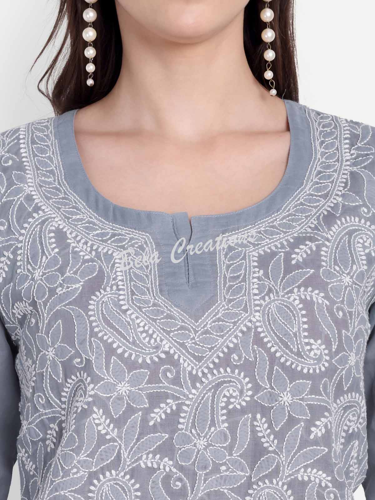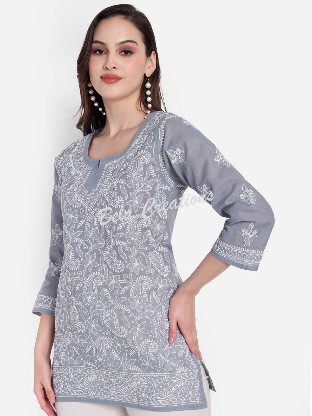 This grey cotton short kurta is detailed with white Chikankari hand embroidery on the front, sleeves, and hem. It has a straight fit, 3/4 sleeves, and a notched round neckline. Soft and breathable, it’s great for everyday wear. Pair it with jeans or trousers for an easy, stylish look.