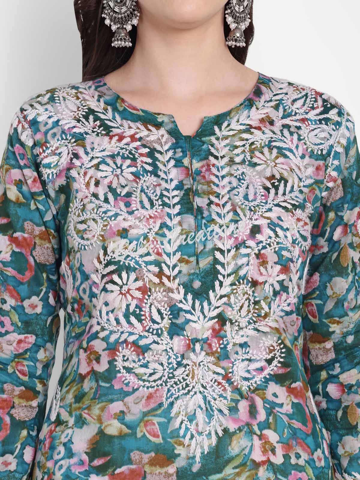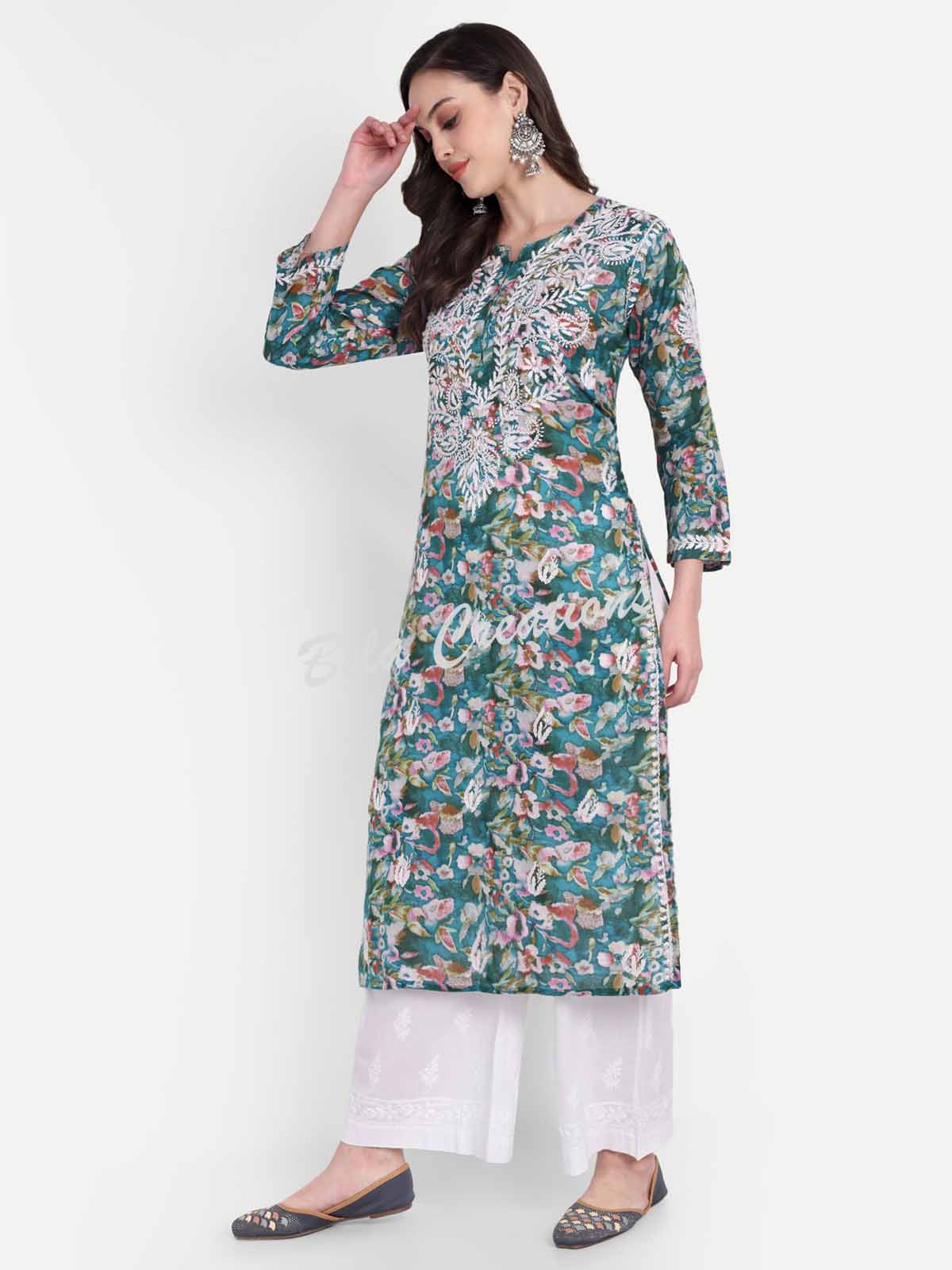 This teal green cotton kurta features a pretty floral print and white Chikankari embroidery on the yoke and sleeves. The straight fit and soft fabric make it comfortable for all-day wear. Pair it with white pants or simple silver jewellery for a clean, graceful look.