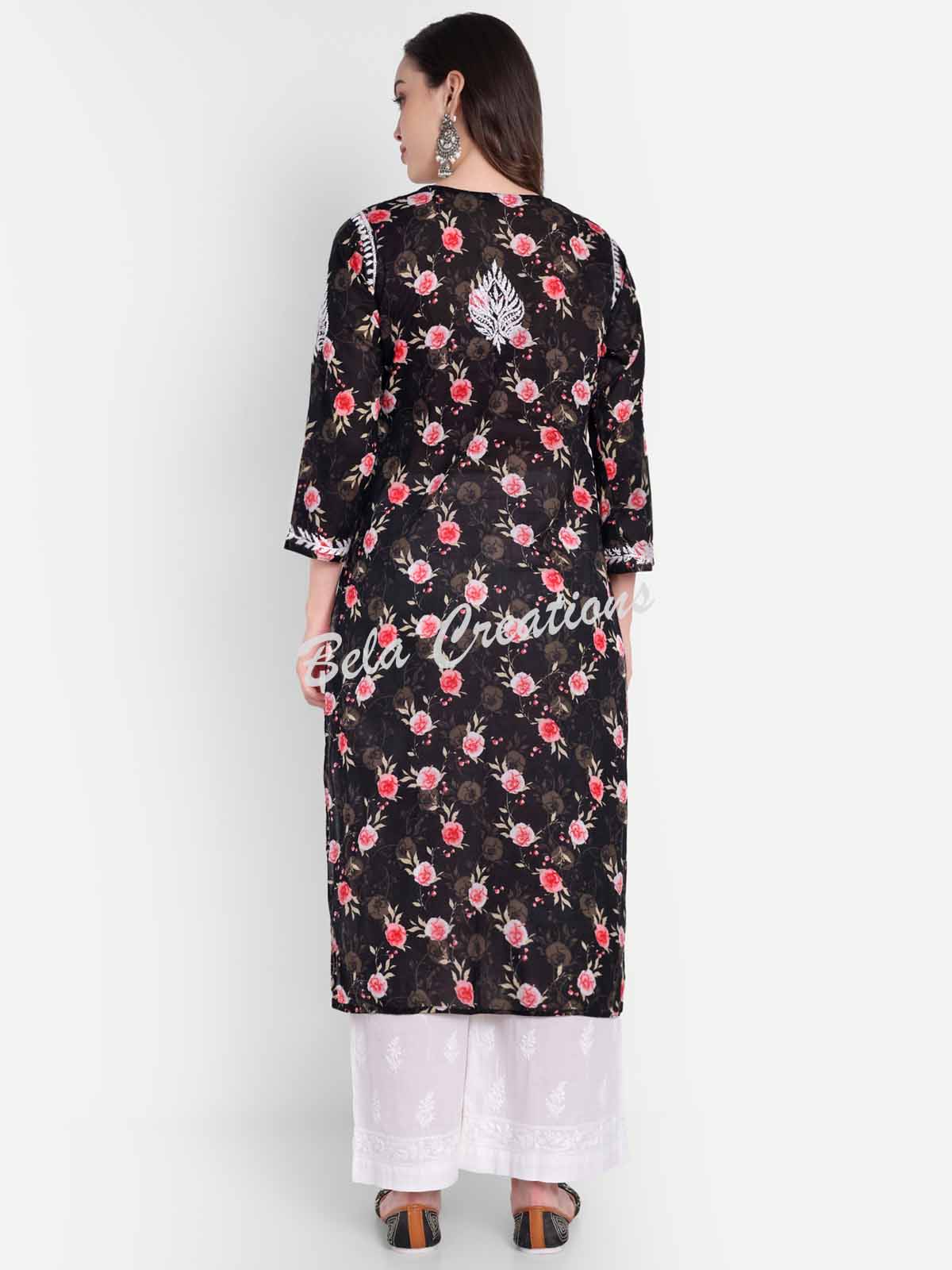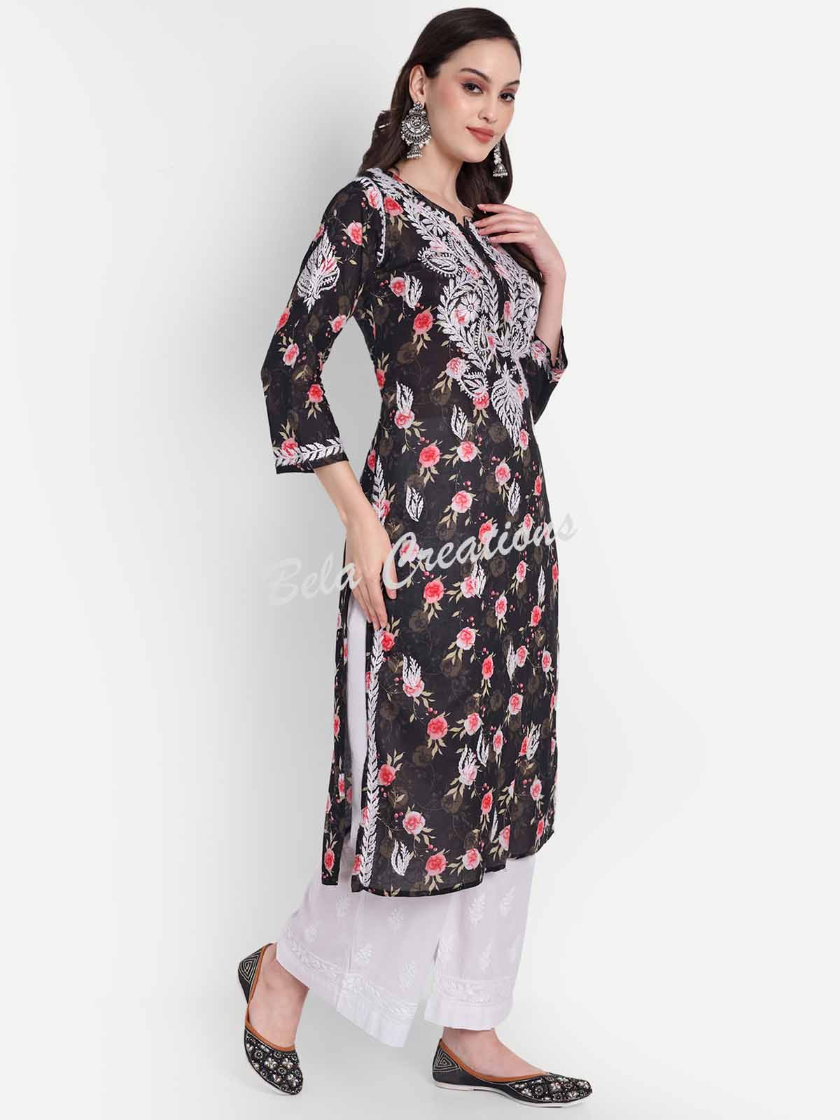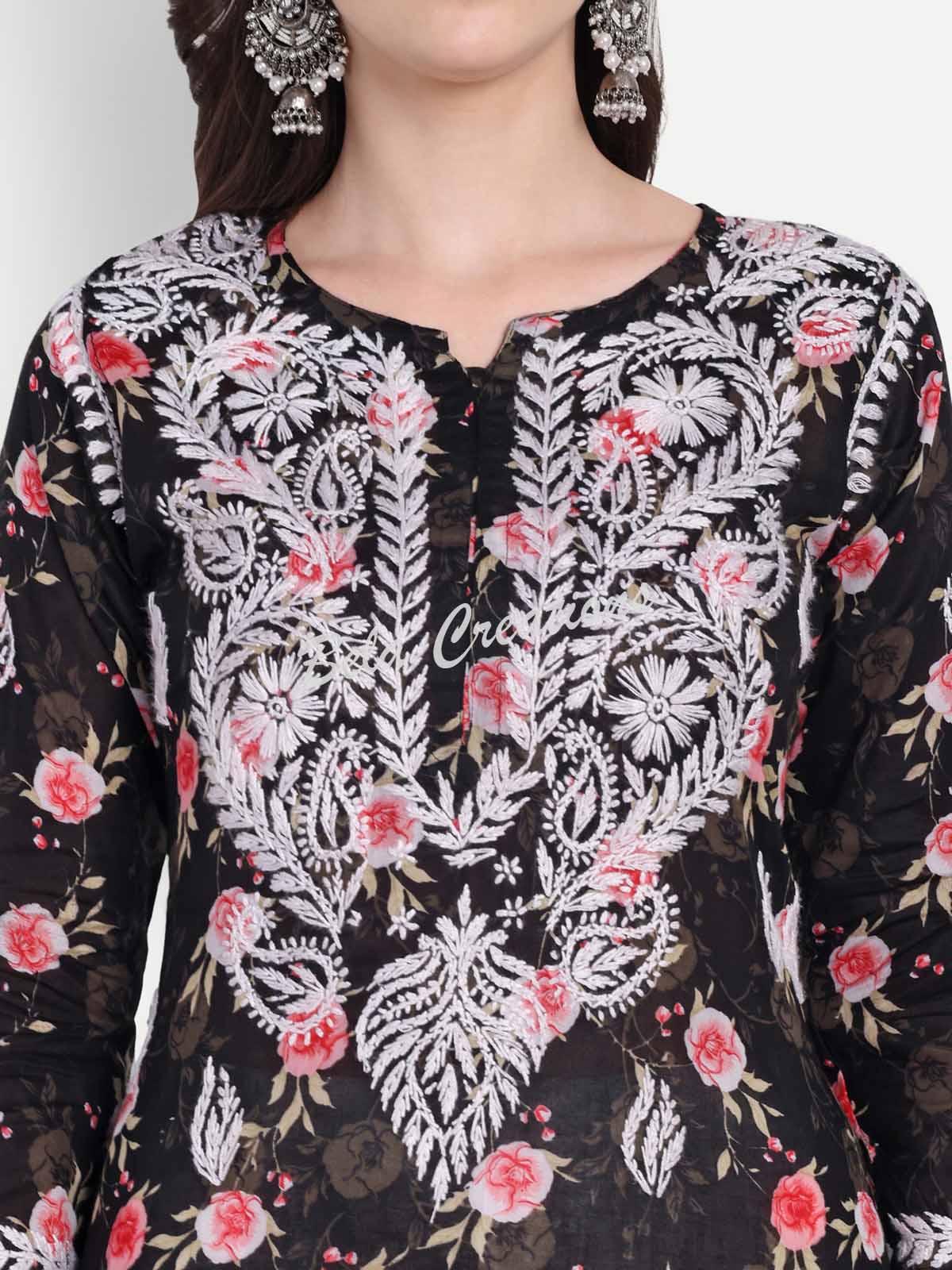 This black cotton kurta is both pretty and comfortable. It has a colourful floral print and white Chikankari embroidery on the yoke that gives it a nice, handcrafted touch. The kurta comes with 3/4th sleeves, a round neckline, and side slits to make it easy to move around in. You can wear it with white palazzos or jeans for a casual daytime look, or add some oxidised jewellery to dress it up for special occasions.
