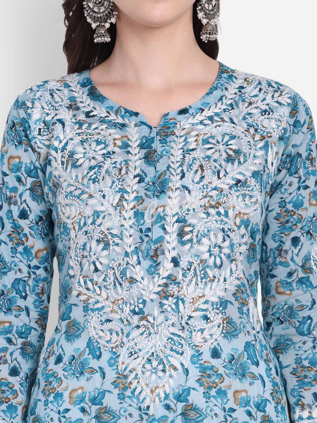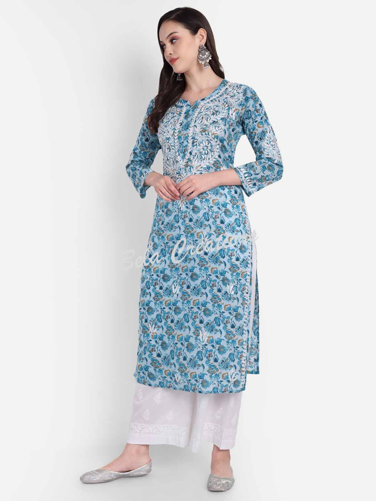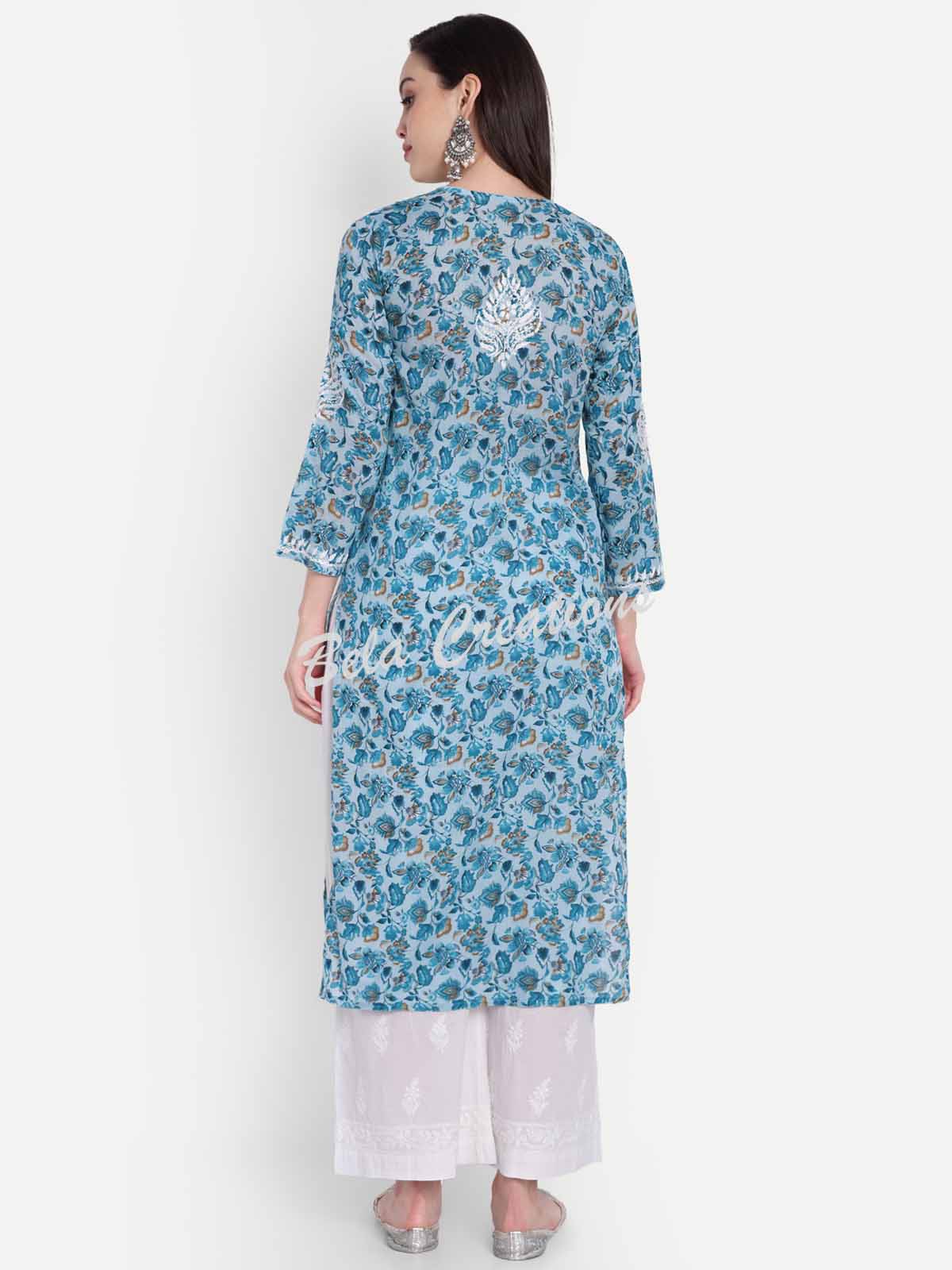 This blue floral cotton kurta features delicate white Chikankari embroidery on the yoke and sleeves. Made from soft fabric with a straight fit, it’s comfortable to wear all day. Style it with white bottoms or simple silver jewellery for a fresh daytime look.