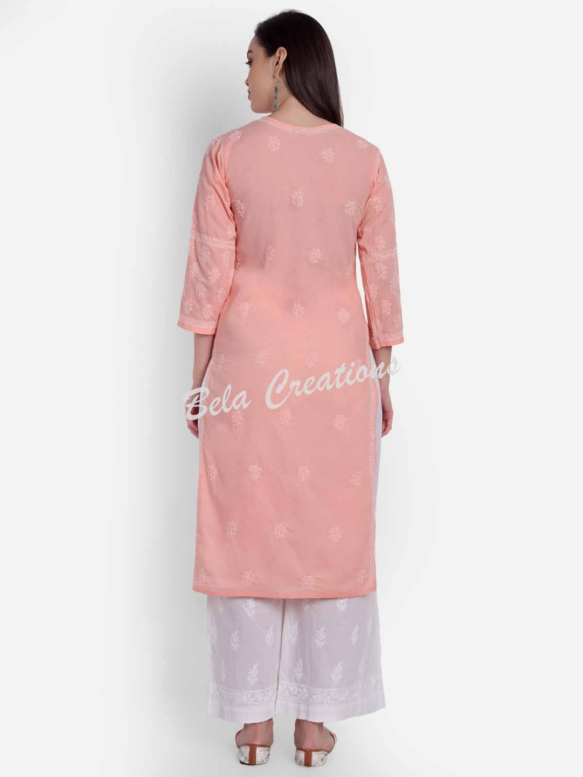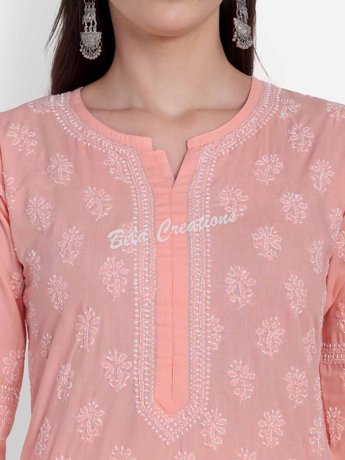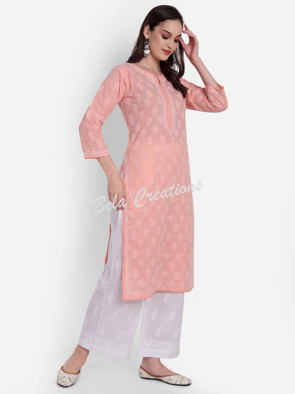 This peach cotton kurta features white Chikankari embroidery on the front, sleeves, and neckline. The straight-fit design with side slits gives it a clean and comfortable look. Made from soft, breathable cotton, it’s perfect for everyday wear. Style it with white palazzos or pants for a fresh and easy ethnic outfit.