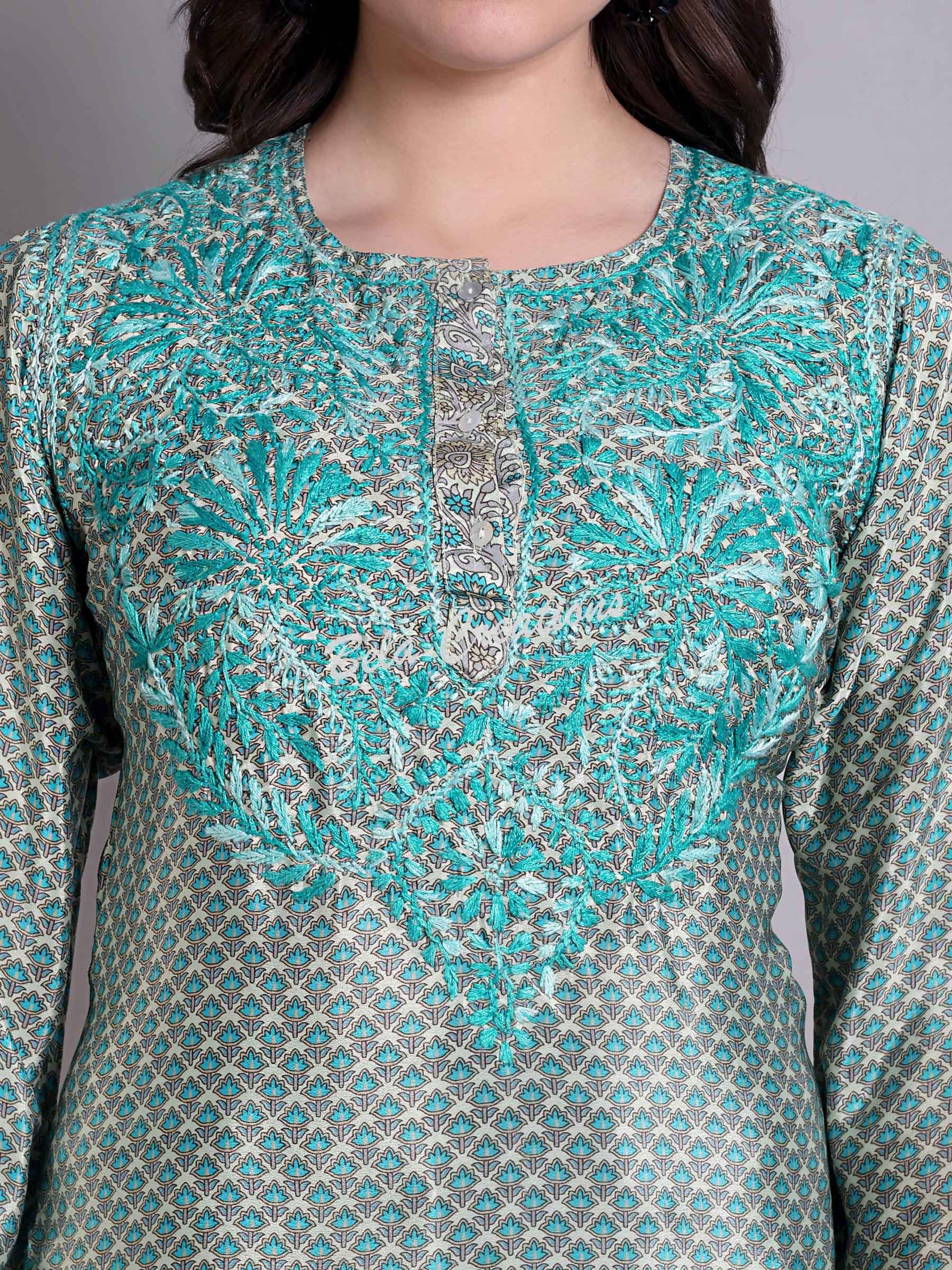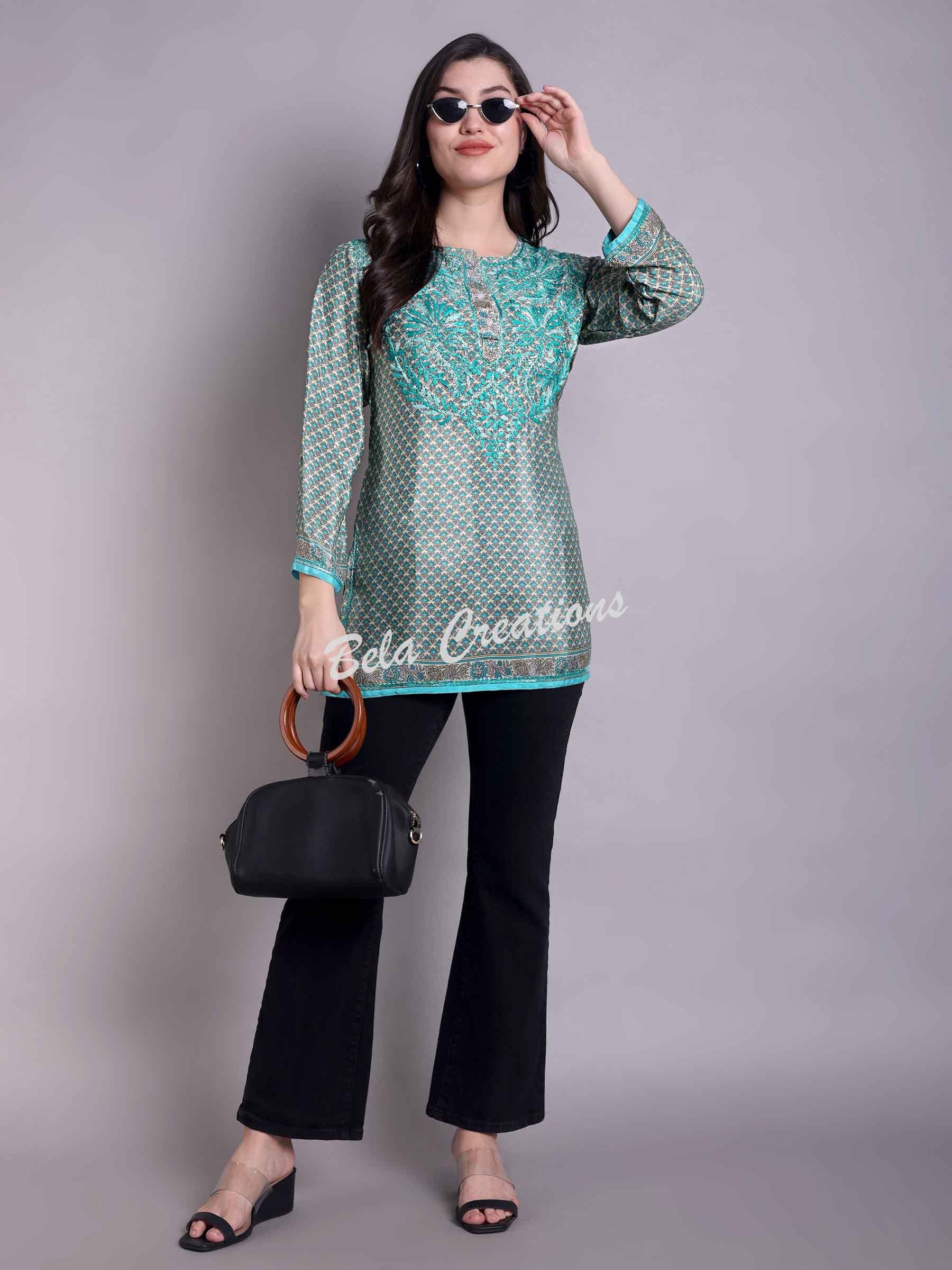 This light green short kurti is made from soft crepe and features blue Chikankari hand embroidery on the front. It’s light, breathable, and easy to wear all day. With its subtle print and relaxed fit, it’s perfect for casual days or office wear. Pair it with jeans or trousers for a neat, everyday look.